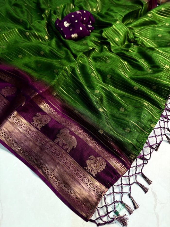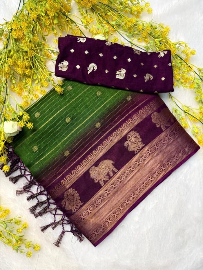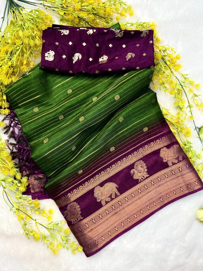 - Design: All-over zari weaving with jacquard border (same as original)