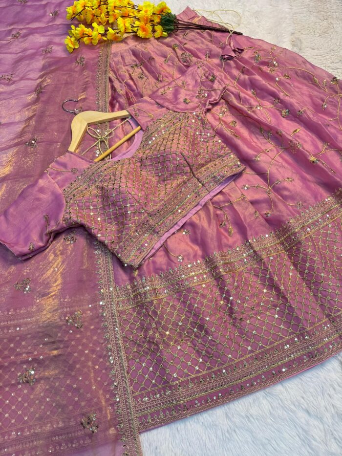 Premium quality space silk half saree featuring intricate zari dori embroidery with sequence and cutdana handwork. Comes with blouse and matching voni.